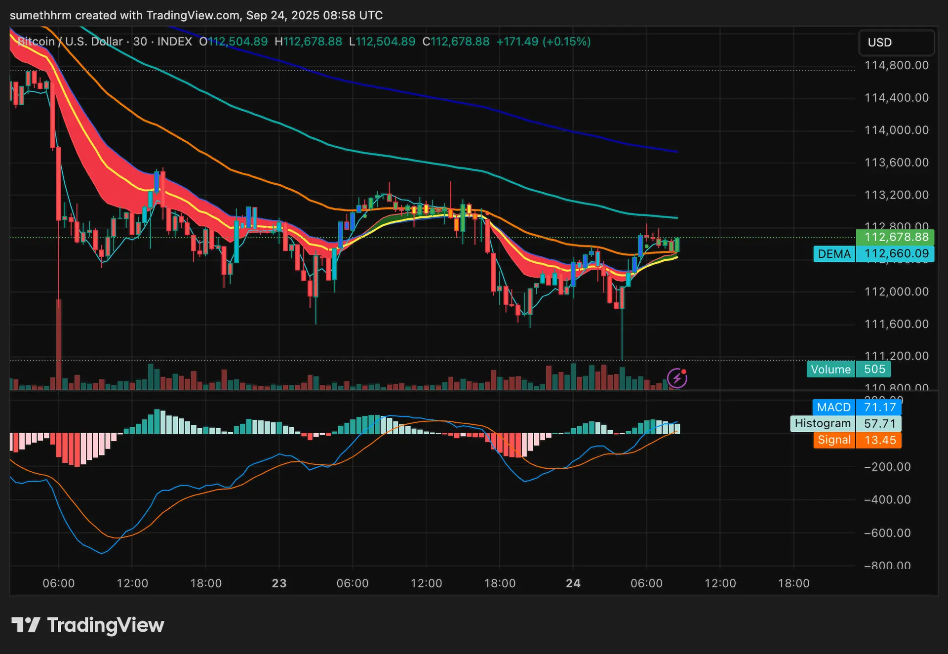 - แนวต้านแรก: 112,800–113,200 (EMA100 + supply zone)